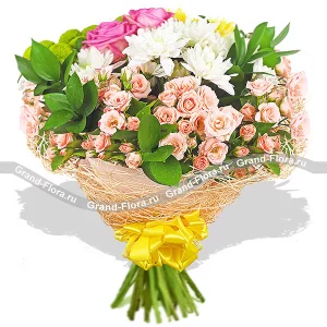 Отправьте своей половинке восхитительный букет из розовых гербер, роз, лилий и эустомы. Она оценит ваш вкус и шикарный поступок. Утонченный цветочный аромат создаст романтическую атмосферу, поднимет настроение, подарит желание творить и восхищаться. В качестве декора использована дизайнерская бумага, в которую и упакован букетик.