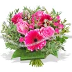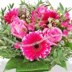 Уменьшенный: малиновая гербера - 2шт., роза розовая - 3шт., роза розовая кустовая - 1шт., декоративная зелень, сетка.