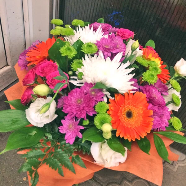 Букет достаточно необычный, много разных цветов и цветовая гамма красивая. не пожалела, что заказала такой букет.