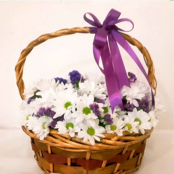 Букет из хрупких цветов, помещенный в плетеную корзинку, является не только чрезвычайно привлекательным, но и оригинальным презентом. Изящные белоснежные хризантемы подойдут к любому торжеству, будь то свадьба друзей, юбилей или день рождения любимой девушки. Также букет станет великолепным решением для вручения маме или сестре на 8 марта.