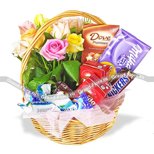 Уменьшенный: шоколад "Milka" - 1 шт., Snikers - 1 шт., шоколад Чудо - 1 шт., шоколад DOVE (12 пожеланий) - 1 шт., Milky Way - 2 шт., Bounty - 2 шт., розы (20 см) - 5 шт., оазис, декор, корзина малая.