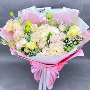 Букет полный изысканности и любовных чувств, в светлых розово – белых тонах. Романтичный настрой композиции, дарит ощущение легкости и теплоты. Воплощенная нежность и очарование, покорит любое сердце и запомнится только приятными эмоциями.