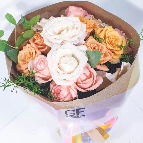 Красочный и в тоже время нежный и изящный букет, расскажет о многообразии Ваших чувств и их наполненности. Свежая цветовая палитра, изысканные формы, непередаваемая красота роз, в одном букете.
